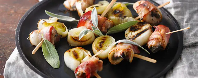 À la place du traditionnel morceau d'oignon en brochette, faites griller des poireaux! Avec du poulet et bacon en plus, vous avez là un parfait mélange aussi original que succulent!
